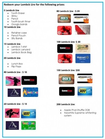 Redeem your Lembck Lire for the following prizes: Click photo for larger view. |